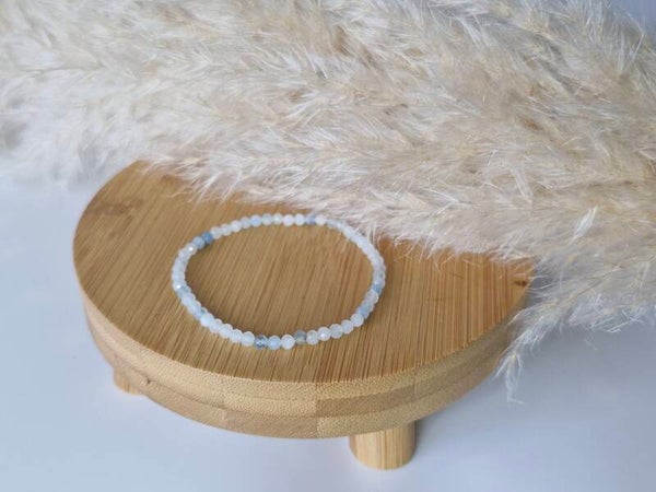 Entdecke unser liebevoll handgefertigtes Armband, das aus 3 mm facettierten Aquamarin Edelstein Perlen besteht. Jede Perle ist einzigartig und verleiht dem Armband einen besonderen Charme. Auf dehnbaren Gummi aufgezogen, passt sich das Armband angenehm deinem Handgelenk an und sorgt für einen hohen Tragekomfort.
