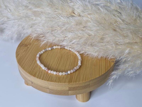 Entdecke unser liebevoll handgefertigtes Armband, das aus 3 mm facettierten Sonnenstein Perlen besteht. Jede Perle ist einzigartig und verleiht dem Armband einen besonderen Charme. Auf dehnbaren Gummi aufgezogen, passt sich das Armband angenehm deinem Handgelenk an und sorgt für einen hohen Tragekomfort.