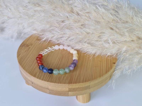 Dieses liebevoll gestaltete Armband besteht aus 6 mm großen Edelstein-Perlen, die den verschiedenen Chakras zugeordnet sind. Jedes Armband ist nicht nur ein modisches Accessoire, sondern auch ein Symbol für Balance und Harmonie.