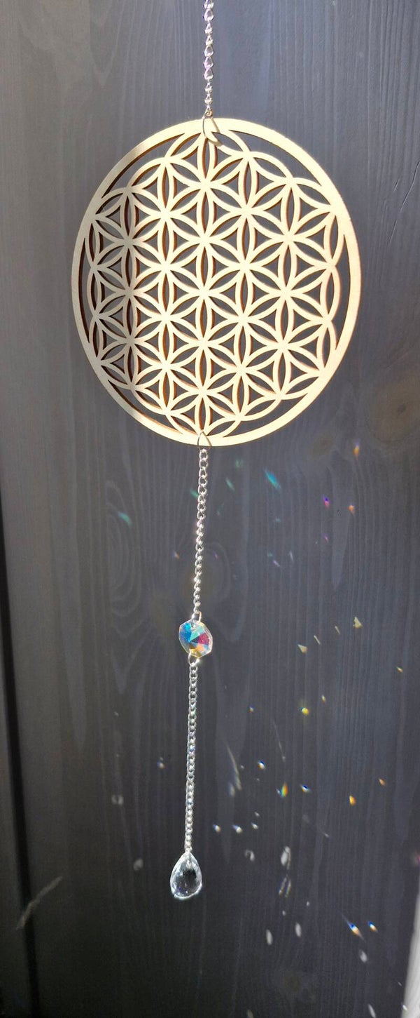 Dieser wunderschöne Sonnenfänger ist mit dem symbolträchtigen Design der Blume des Lebens aus Holz verziert und wird durch eine silberfarbene Kette ergänzt.